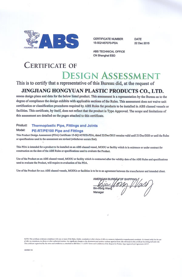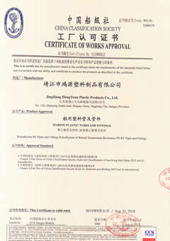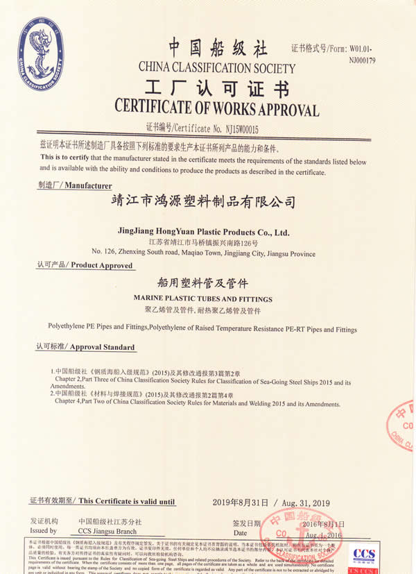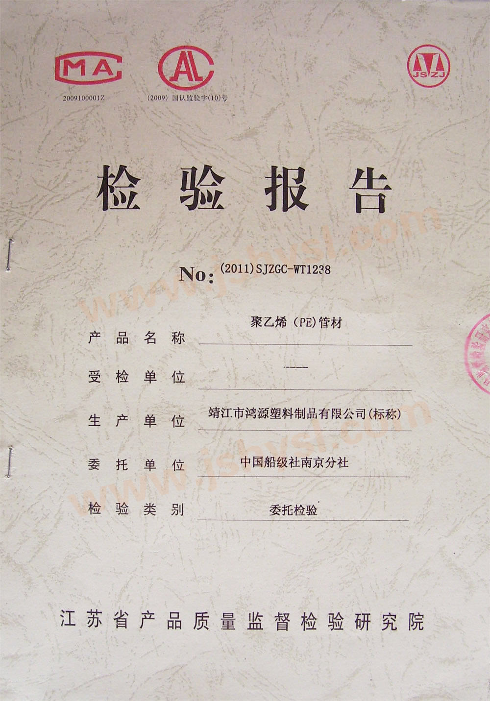 公司“鸿源”牌产品主要为船用供水及排水系统的管材及管件,工程用地暖管、PPR管等。公司拥有MA2000、MA4000、MA8000等全套注塑装置及SJ65/33、SJ75/33、BRD315等多条挤出生产线,并配套熔体流动速率测定仪、落锤冲击试验机、管材静液压爆破试验机、电子拉力试验机、差热分析仪等多台产品质量控制和检测设备。产品全部采用优质原料生产,性能符合GB/T13663-2000,CJ/T175-2002,CJ/T108-1999,IM0753(18)及德国DIN8077、DIN8078有关标准。
